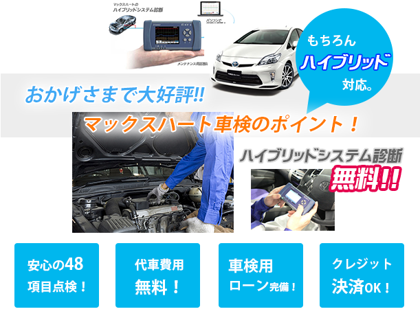 マックスハート車検では、大切なお車を安全でより長く快適に乗って頂く為に「48項目点検・整備」を実施しております。
